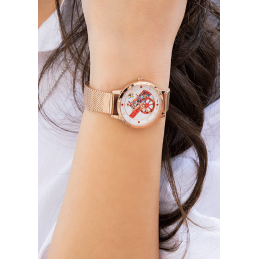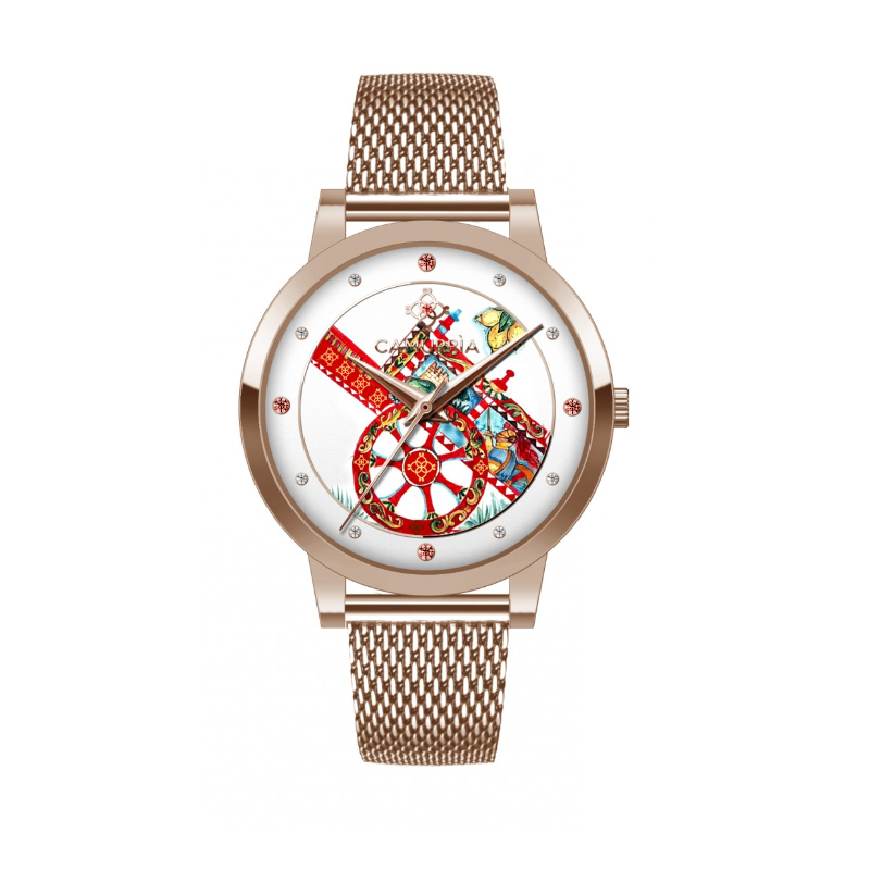 Orologio Milano, della linea U Carrettu, con cassa 32mm in metallo e cinturino in acciaio con finitura rosegold. Un orologio dal design tipicamente siciliano, grazie alle stampe del carretto siciliano e i motivi tipicamente siciliani.