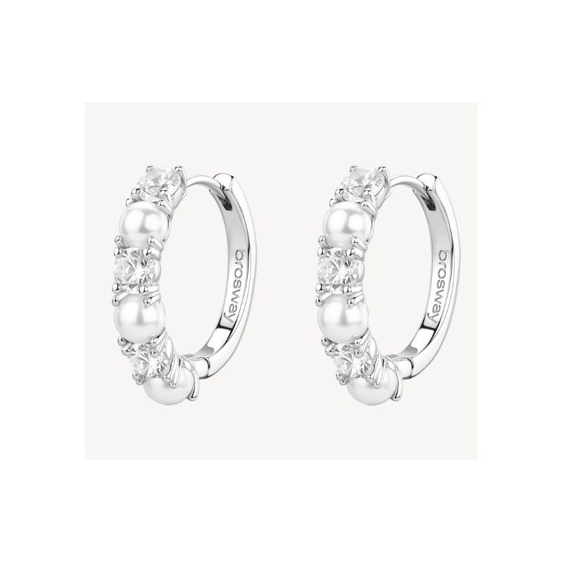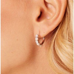 Orecchini a cerchio in argento rodiato 925‰ con perle di conchiglia e cubic zirconia.