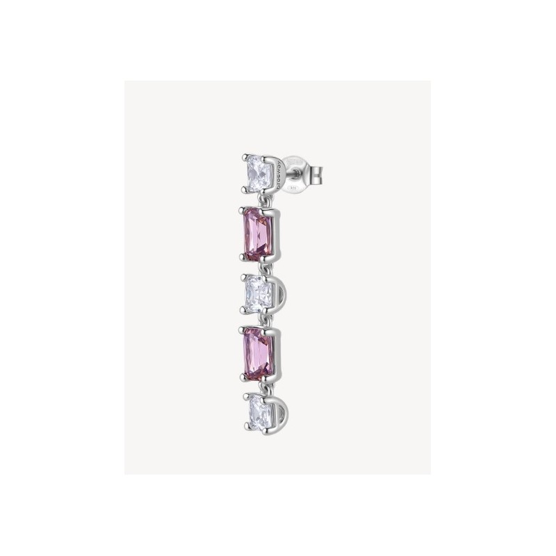 Orecchino singolo pendente in argento rodiato 925‰ con cushion cubic zirconia chiari e baguette cubic zirconia colore vintage rose.